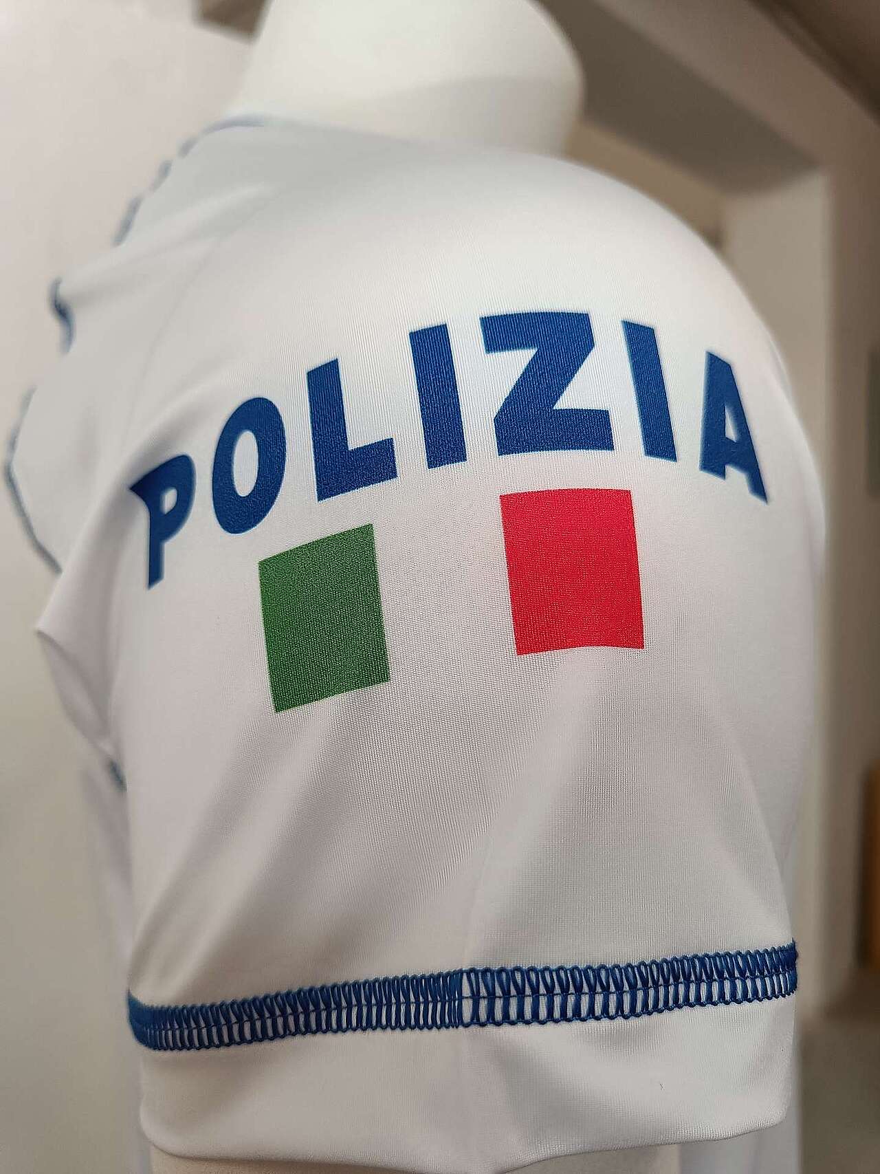 Presente il tricolore stampato sulla manica e la scritta "Polizia" sotto di esso.