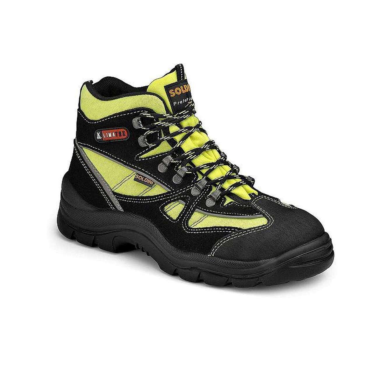 Alta visibilita', morbida e leggera, con tomaia in pelle scamosciata colore nero, idrorepellente con inserti in cordura gialla ad alta resistenza allo strappo. Puntale antischiacciamento resistente a 200 J e lamina antiperforazione in materiale composito. Plantare anatomico estraibile Light. Fodera in tessuto Klimatex, impermeabile e traspirante con cuciture termosaldate. Suola antistatica, antiscivolo, anticalore.