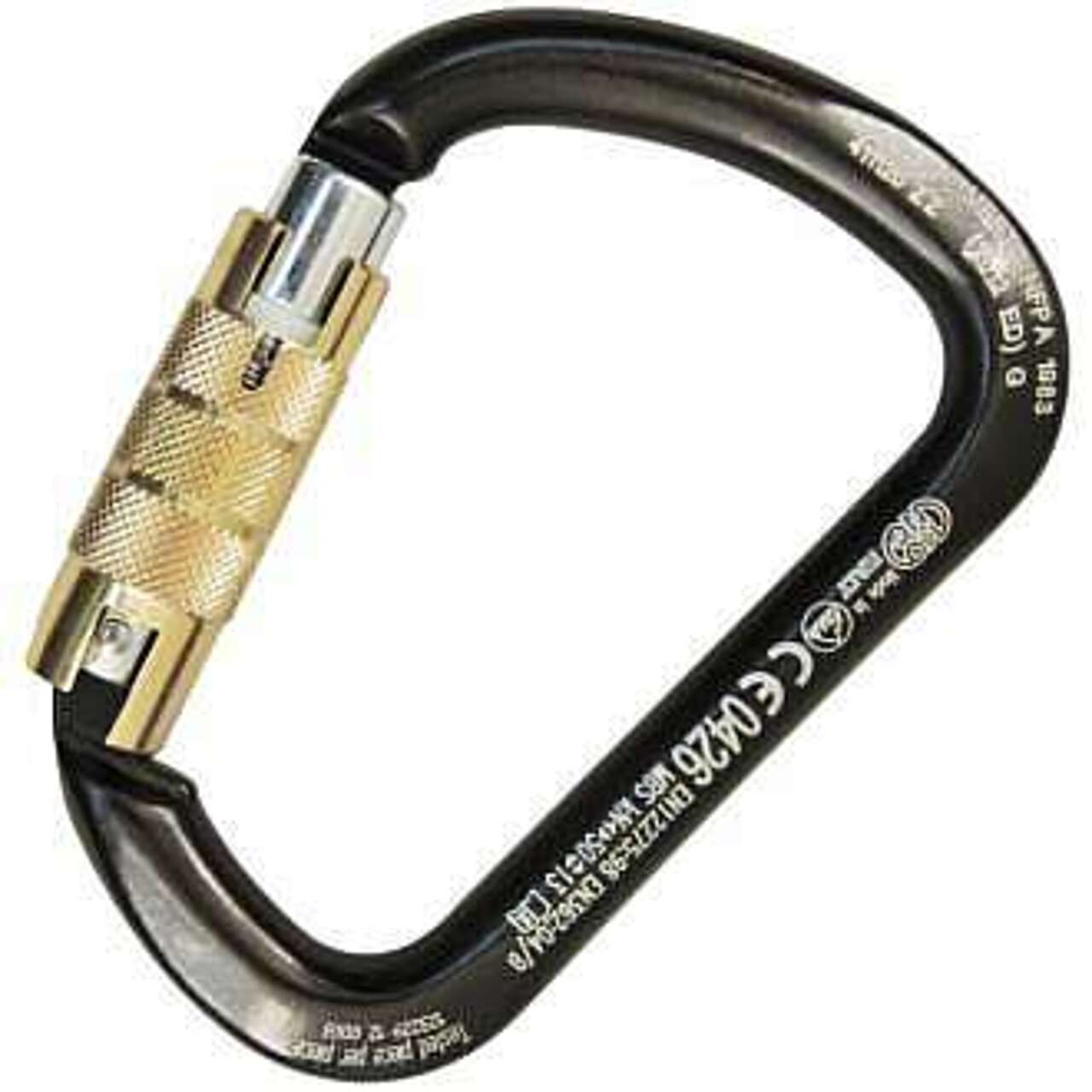 Moschettone in acciaio al carbonio con ghiera Twist Lock. La serie X-Large #039;e8 concepita per offrire ampia apertura della leva e un elevato carico di rottura. La particolare forma a D evita la rotazione del moschettone e permette di distribuire maggiormente il carico lungo l'asse maggiore.