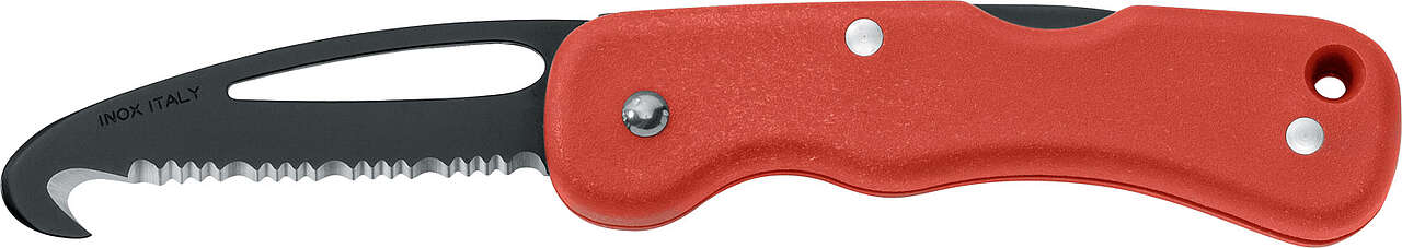 Coltello chiudibile pieghevole da soccorso.Lama dentata in acciaio inox W 1.4034, durezza 55-56 HRC.Manico in materiale plastico G15.Spessore lama:2,5 mmLunghezza lama:7 cm