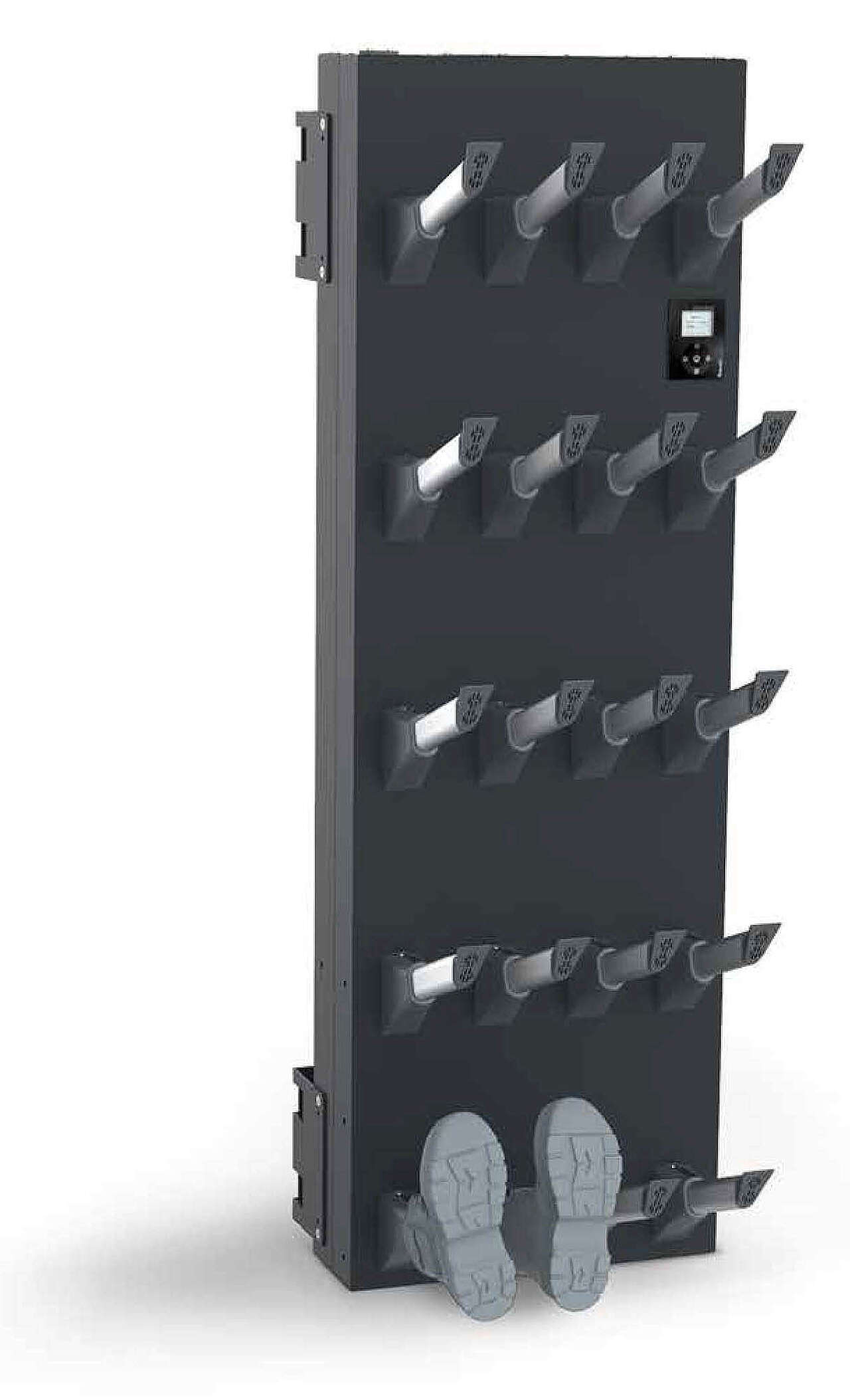 Sistema di asciugatura aperto per 10 paia di scarpe grazie ai 20 bracci di asciugatura in alluminio con speciali ugelli di asciugatura in plastica per scarpe
