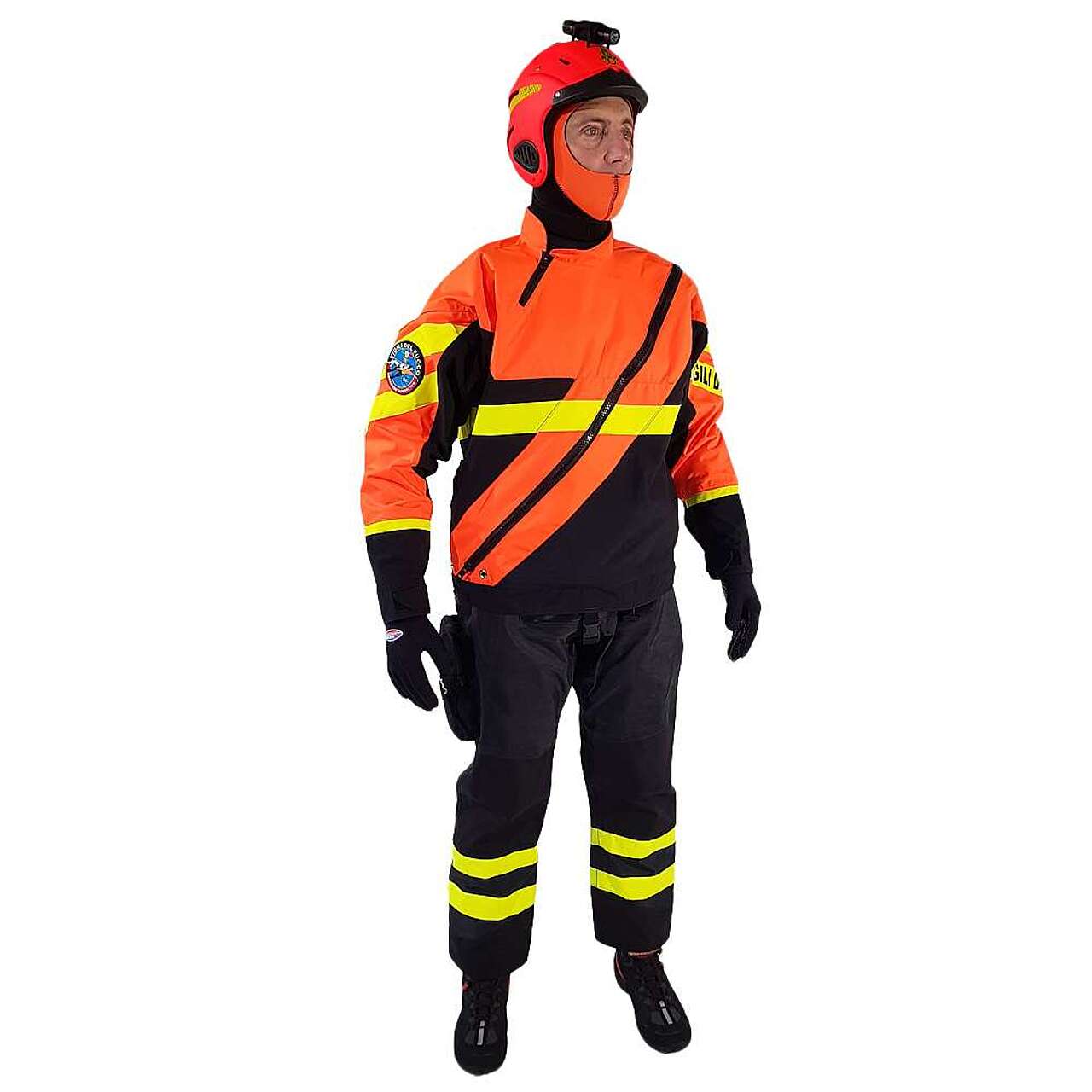 Idrocostume concepito per l'intervento in ambiente acquatico, realizzato in tessuti misti e a spessori differenziati per garantire la massima robustezza e comfort.