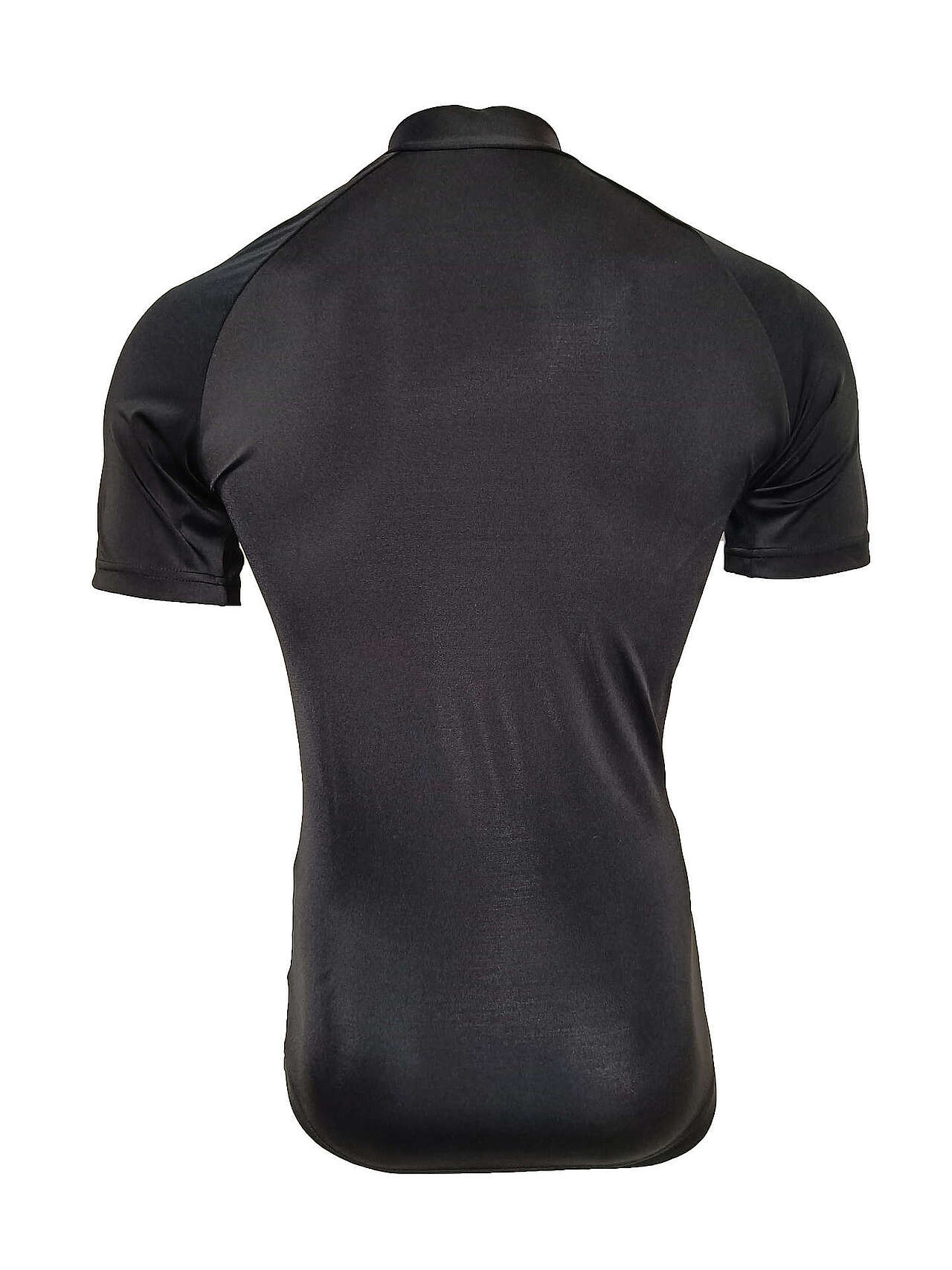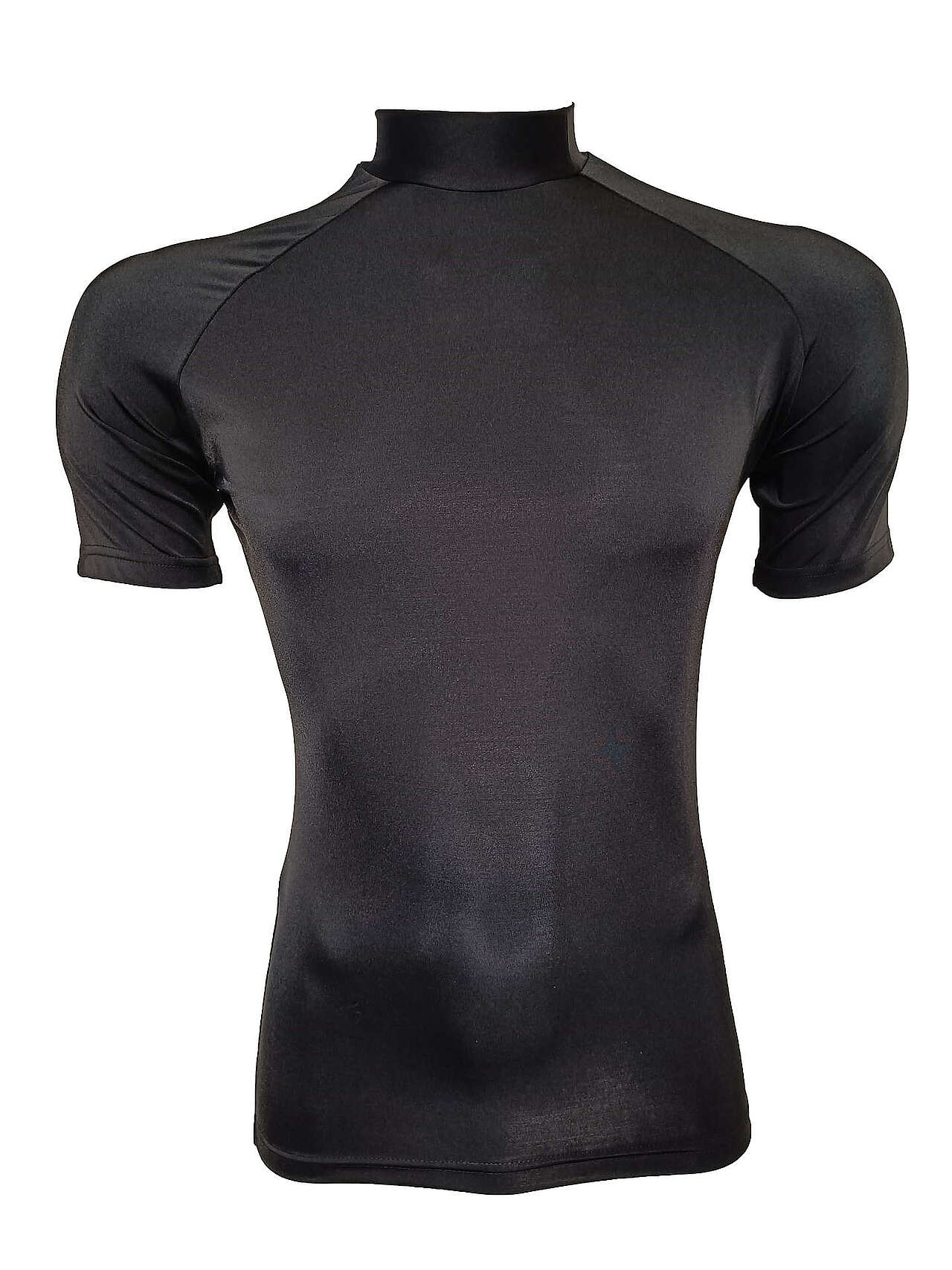 Maglietta a manica corta in lycra leggera bielastica molto aderente. Cucitura interna piatta. Il taglio particolare mantiene il capo aderente e concede la massima mobilita' delle braccia.