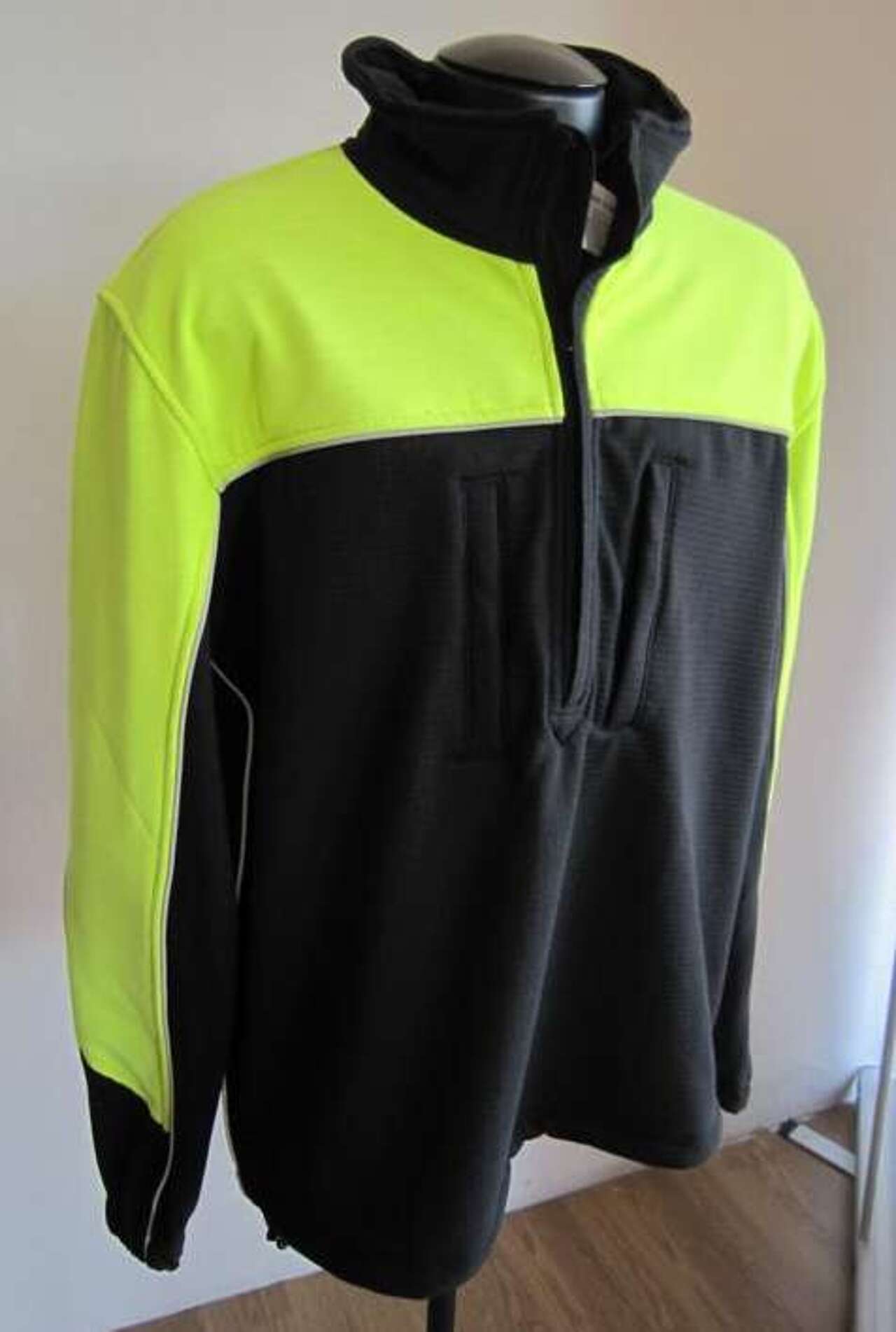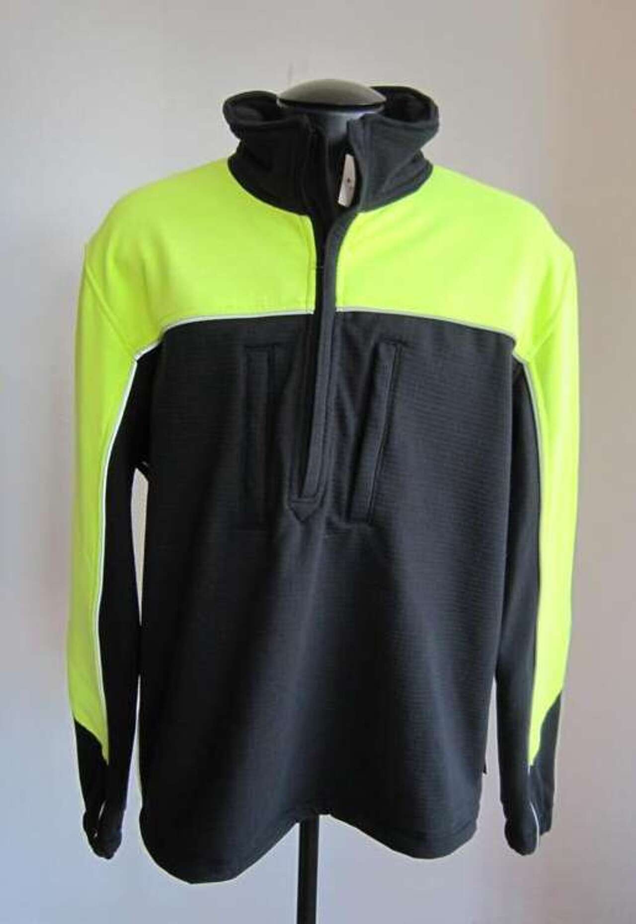 Maglione tecnico nero/giallo alta visibilità preformato, sagomato, in tessuto Pile monoelastico flame retardant. Collo alto con zip protetta, due tasche verticali al petto, coulisse di regolazione sul fondo.