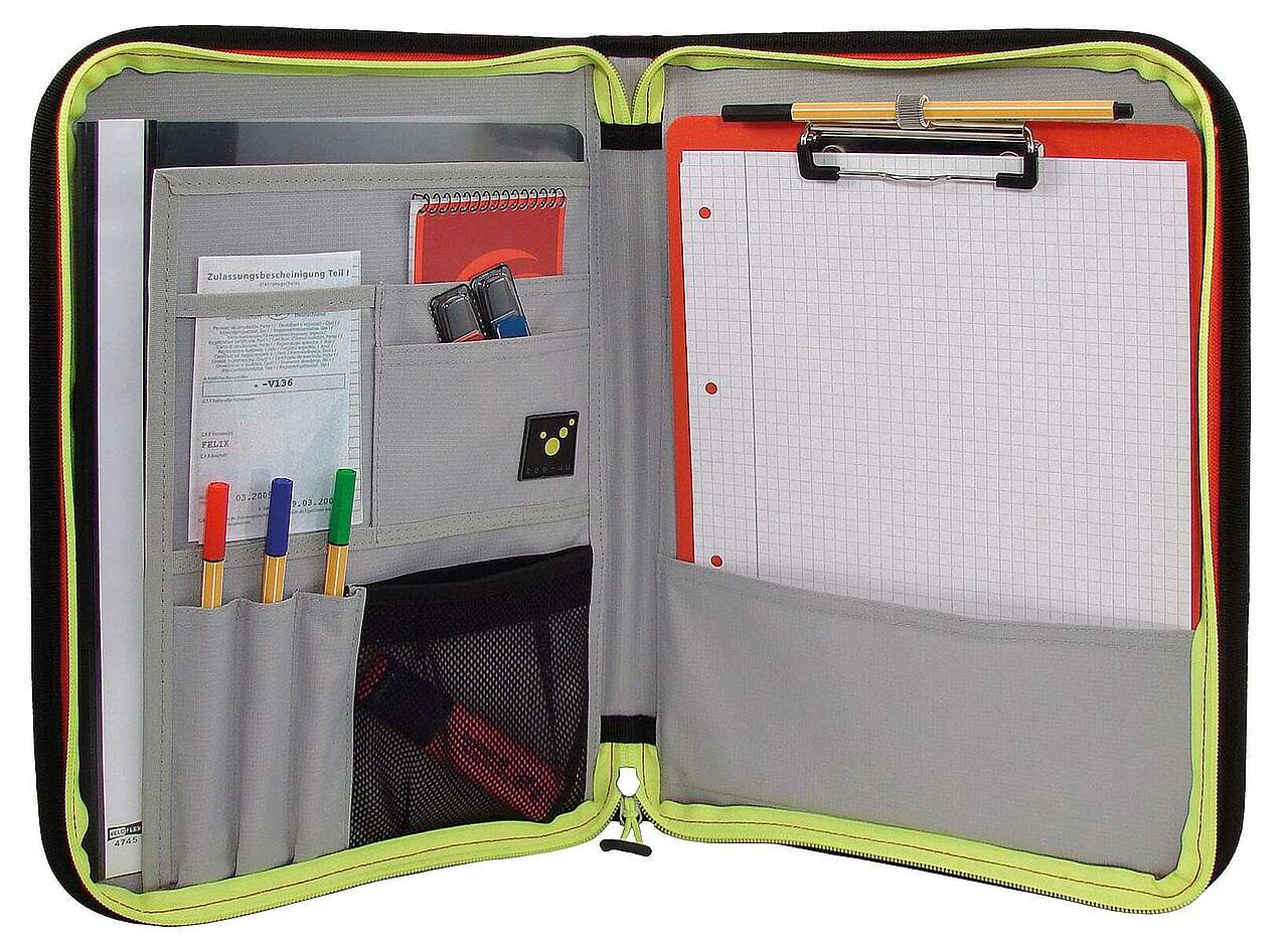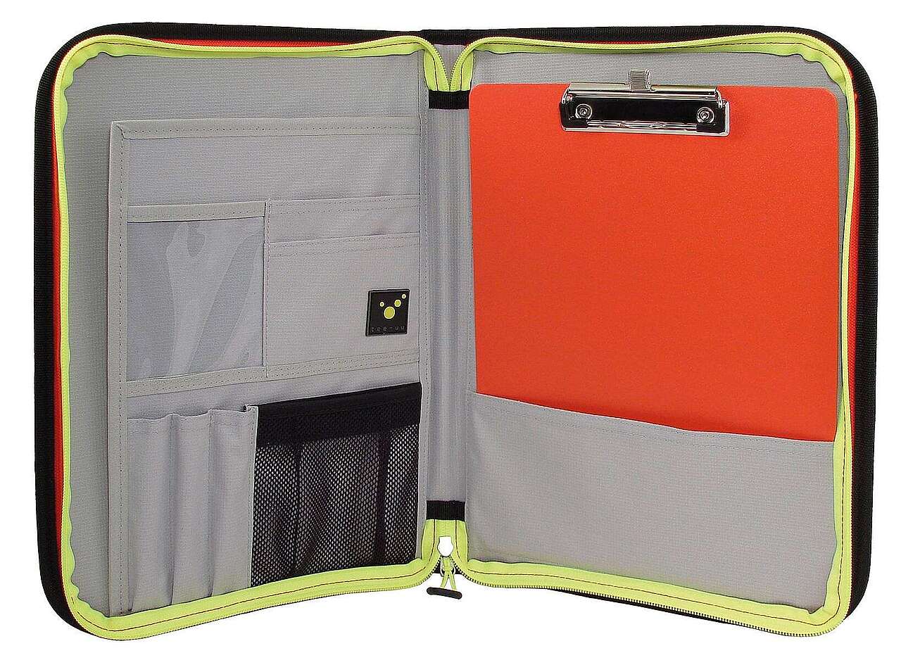 Cartellina portadocumenti che offre spazio per penne e altri accessori in scomparti interni di diverse dimensioni nonché a documenti fino a DIN A4.