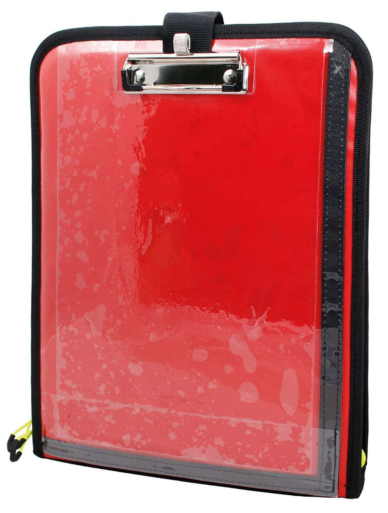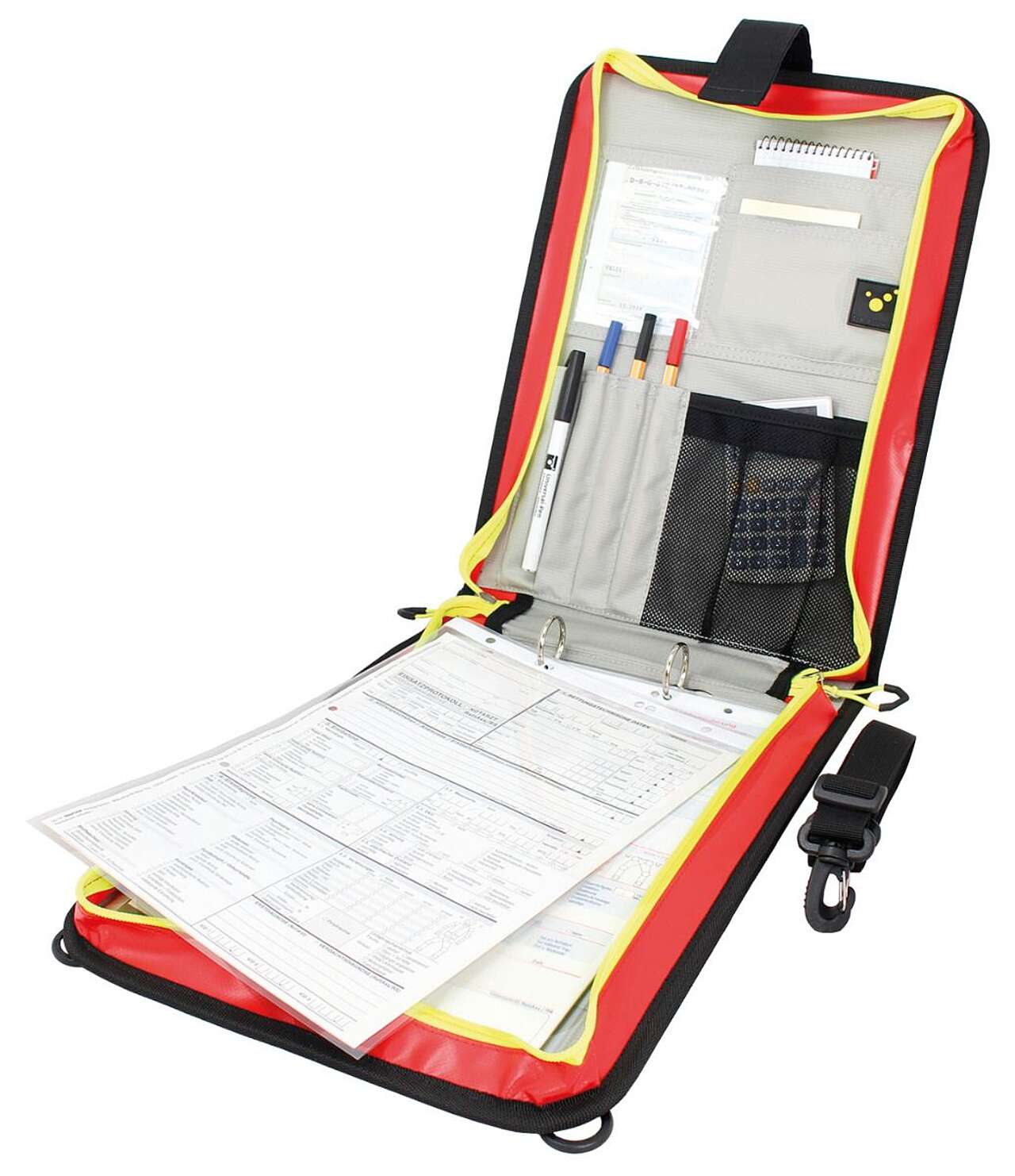 Cartella porta documenti in formato DIN A4, competa di anelli e 10 fogli. Dotata di tasche e scomparti per formulari e moduli, tasca esterna trasparente per tablet o pc.