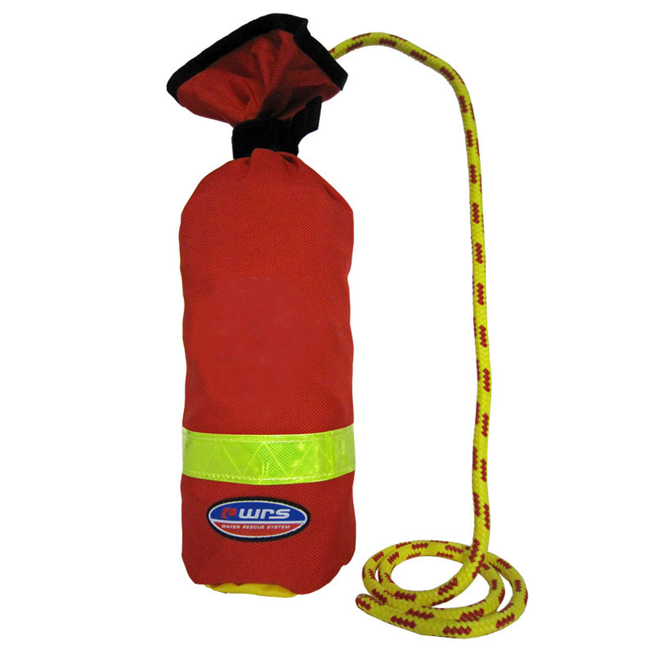 Sacchetto in cordura antistrappo, dotato di banda fluorescente, forma con bocca allargata, rapida apertura e chiusura con fettuccia di velcro. Corda statica galleggiante gialla intrecciata con spia rossa.