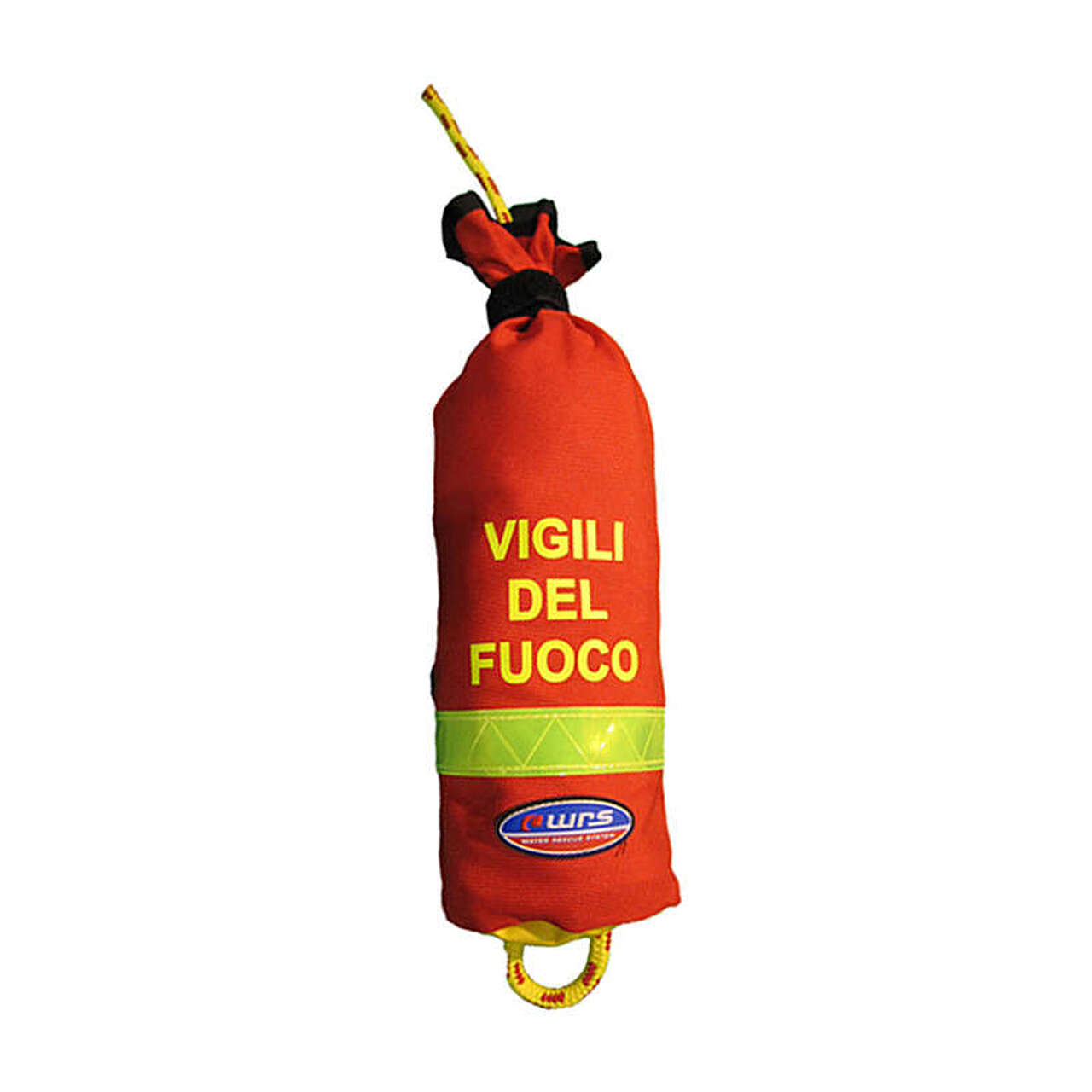 Sacchetto in cordura antistrappo, dotato di banda fluorescente, forma con bocca allargata, rapida apertura e chiusura con fettuccia di velcro. Corda statica galleggiante gialla intrecciata con spia rossa.