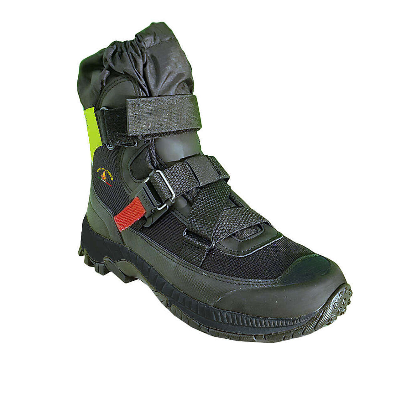 La tomaia è dotata di fori svuotamento acqua e rinforzata lungo il bordo esterno con una fascia di gomma incollata e priva di cuciture. Ghetta regolabile e chiusura con fettuccia a doppio incrocio. Dispositivo di chiusura/apertura rapido brevettato di tipo magnetico. Suola dedicata VIBRAM con mescola specifica per l’#039;92acqua.